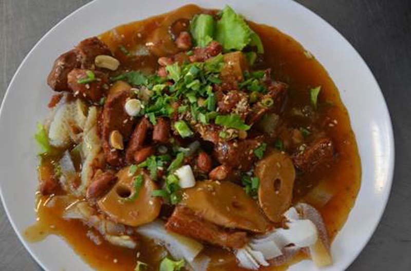 อีกรายการหนึ่งที่ก่อนกินราดน้ำแดงเป็นเนื้อหมูหรือเนื้อวัว แบบแห้งก็คลุกเคล้าเส้นราดหน้า โรยถั่วลิสง หน่อไม้ มีน้ำจิ้มเป็นน้ำกะปิเหลว