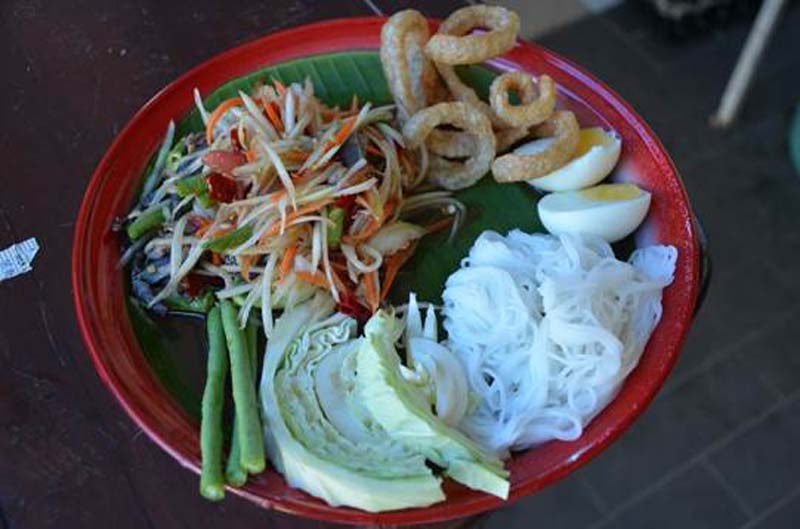 สังเกตตามโต๊ะของสาวๆ มักจะเห็นส้มตำถาดใหญ่นี้วางไว้แทบทุกโต๊ะ เรียกได้ว่าอิ่มกันทั้งโต๊ะ เพราะมีส่วนประกอบทุกชนิดคือ ไข่ต้ม ขนมจีน แคบหมู ส้มตำปูหรือตำอะไรก็แล้วแต่ ปริมาณสักหนึ่งครกใหญ่