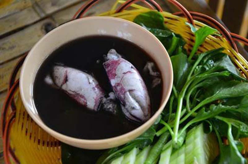 น้ำต้มหมึกที่สีดำของน้ำซุปดูไม่ค่อยน่ากินนัก หารู้ไม่ว่าน้ำต้มยิ่งมีสีดำก็จะยิ่งหอม เพราะต้องเป็นหมึกสดที่เพิ่งขึ้นจากทะเลใหม่ๆ ใช้หมึกล้วยสดไม่ต้องผ่าเอาเครื่องในออก แล้วต้มทันที ปรุงรสเปรี้ยวหวานเค็ม ได้กลิ่นอายของทะเล หอมถึงไหนๆ เป็นรายการยอดนิยมของร้านนี้ ใครเห็นเป็นต้องสั่ง