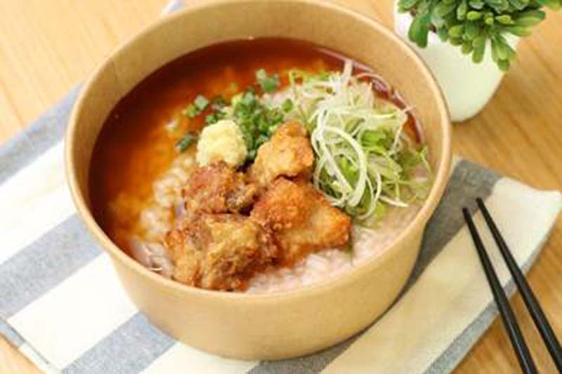 หน้าไก่ชุบแป้งทอดแบบญี่ปุ่น ชุบแป้งผสมน้ำขิง ทอดได้กรอบจนวางบนหน้าข้าวต้มแฉะก็ยังไม่หายกรอบ