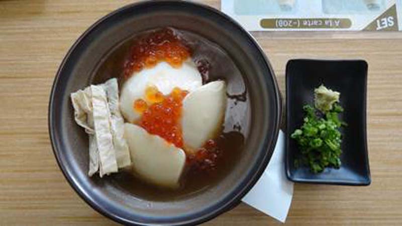 เป็นจานโปรดปรานของผู้เขียนที่ต้องยกให้ 5 ดาว เป็นอาหารที่เรียบง่าย กินแล้วชื่นใจ ไข่ปลาแซลมอนดองทั่วๆ ไปรสจะออกเค็ม เมื่อตักกินพร้อมเต้าหู้อ่อน รสเค็มจะเจือจางเหลือไว้แต่รสกำลังดีและกลิ่นไข่ปลาผสมกลิ่นเต้าหู้