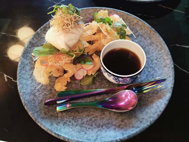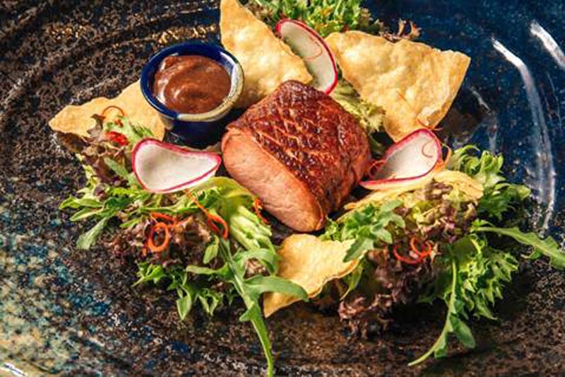 Smoked-Duck Salad เชฟได้คัดสรรเนื้ออกเป็ดคุณภาพดี หมักให้ซึมซับกับสมุนไพร แล้วเอาไปรมควันให้หอมจรุงกลิ่นเครื่องเทศ เมื่อยกมาหั่นจะได้เป็ดที่เนื้อนุ่ม ชุ่มฉ่ำ ไม่แห้งแล้ง ความพิสดารอยู่ที่ใช้น้ำสลัดนูเทลล่าผสมน้ำเชื่อมเมเปิล เมื่อเคล้ากันแล้วจะให้อีกมิติของรสชาติที่กลมกล่อมหอมหวานอย่างคมคาย เสิร์ฟพร้อมกับแผ่นแป้งตอร์ติญ่าทอดกรอบ
