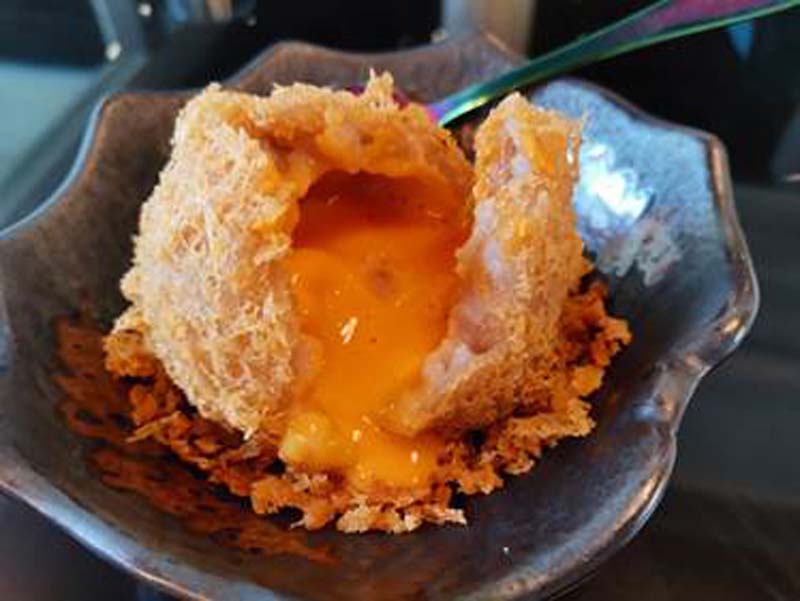โดยทั่วไปเมื่อเราไปกินติ่มซำตามร้านจีนกวางตุ้ง มีของกินเล่นอยู่อย่างหนึ่งคือเผือกทอด เป็นการยีเนื้อเผือกสุกผสมผงแอมโมเนียเล็กน้อย แล้วเอาไปปั้นเป็นก้อนรีๆ สอดไส้ด้วยเครื่องเครา ส่วนวิธีการปรุงของที่นี่ ใช้ไส้เป็นครีมลาวาเยิ้มมาปั้นเป็นลูกใหญ่เท่ากำปั้น แล้วทอดให้ขึ้นฟู เมื่อเจาะไส้ลาวาแตกเยิ้มยังความตื่นเต้นให้ผู้ร่วมโต๊ะไปตามกัน