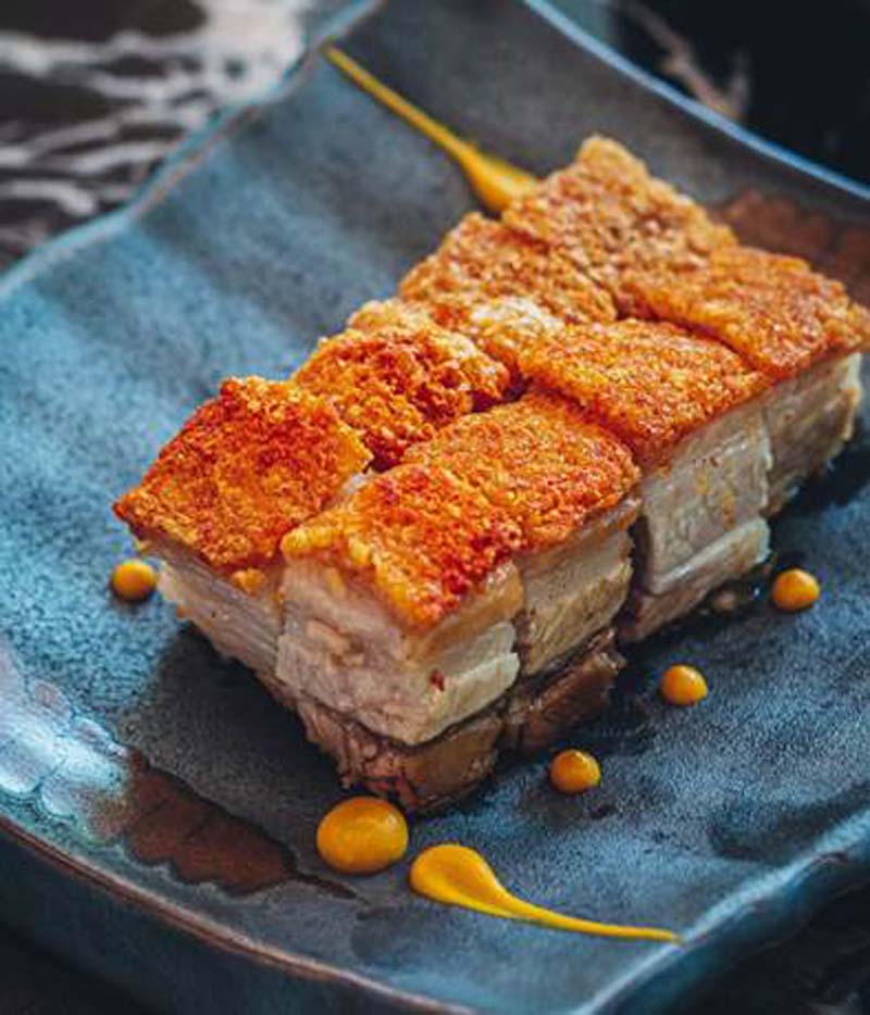 เชฟคัดเนื้อหมูส่วนท้องอย่างดีที่มีชั้นไขมันติดเนื้อติดหนังที่บางกำลังกิน ผิวด้านนอกกรอบกรุบ มีรสออกเค็มพอดิบพอดี สำหรับตัดกับความมันในชั้นมันติดหนังหมู ได้กลิ่นหอมจางๆ จากกานพลู จิ้มกินคู่กับซอสรสเลิศที่เชฟทำเอง ผู้ที่กลัวอ้วนไม่ต้องกังวลมากถึงไขมัน เพราะหมูกรอบที่นี่ไม่ได้ผ่านการทอดในน้ำมันแต่อย่างใด จานนี้ถ้าไม่สั่งมาชิมถือว่าพลาดบางอย่างในชีวิตทีเดียว