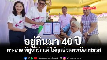 40ปีที่รอคอย ตา-ยายควงแขนจดทะเบียนสมรส เสริมสิริมงคลหน้าหลวงพ่อใหญ่วัดม่วง