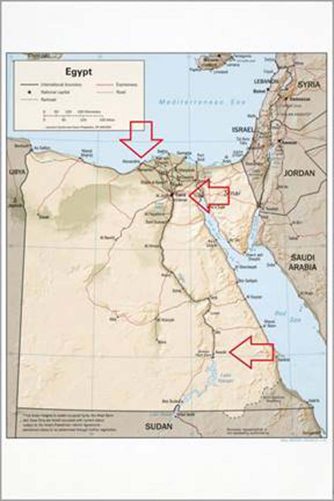 (แผนที่อียิปต์ ลูกศรบนสุดคือ อเล็กซานเดรีย ถัดลงมาก็คือ ไคโร และล่างสุดก็คือ อัสวาน อันเป็นที่ตั้งของวิหารฟิเลย์-ภาพจากกูเกิ้ล แมพ)