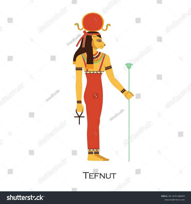(เทพี เทฟนุต เทพีแห่งละอองหมอก ความชื้นในอากาศ น้ำค้าง และ ฝน ที่น่าสนใจก็คือ ใบหน้าของเทฟนุตจะคล้ายกับเทพีเซ็คห์เมต เทพีแห่งสงคราม - ภาพจากวิกิพีเดีย)