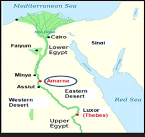(เมือง อามาร์นา ตั้งอยู่ทางเหนือของเมืองธีบส์ขึ้นไปประมาณ 400 กิโลเมตร - ภาพจากกูเกิล)