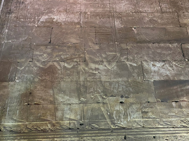 (บนผนังของวิหาร แสดงภาพสลักของนักบวชเดินร่วมไปกับขบวนแห่ของเทพเจ้าอย่างใกล้ชิดสะท้อนถึงอิทธิพลที่สูงมากต่อศาสนา และ วิหาร-ภาพโดยผู้เขียน)