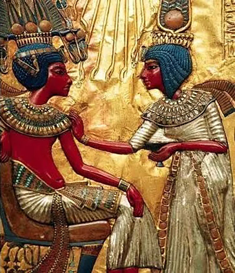 (ภาพบนพนักพิงหลังของบัลลังก์ของตุตอังห์อะเตน อังเคเซนพาเทน กำลังชะโลมของเหลวลงไปบนไหล่ของ อุตอังห์อะเตน)