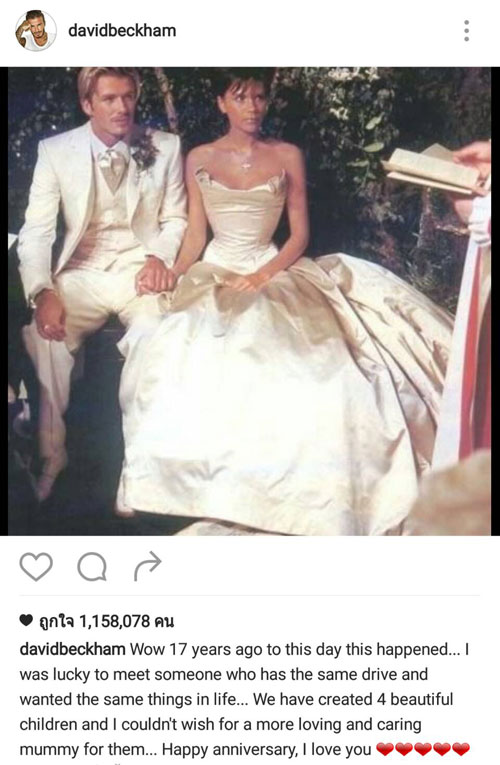 โดยฝ่าย เดวิด เบ็คแฮม ได้เขียนความในใจไว้ว่า "17 ปีที่ผ่านมาจนถึงวันนี้มีเรื่องราวเกิดขึ่นมากมาย ผมโชคดีมากที่ได้พบกับคนที่มีความชอบและใช้ชีวิตเหมือนๆ กัน เราสองคนได้สร้างสิ่งสวยงามด้วยกันคือเด็กๆ ทั้ง 4 คน สุขสันต์วันครบรอบแต่งงานนะครับ ผมรักคุณ"