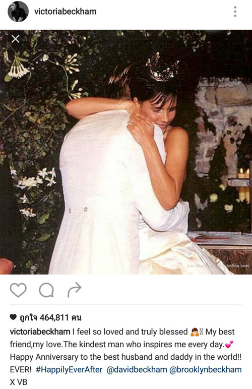 ส่วน วิคตอเรียก็หวานไม่แพ้กัน "ฉันรู้สึกว่ามันเป็นความรักและความสุขอย่างแท้จริง คุณเป็นเพื่อนสนิท เป็นสามีที่รัก และเป็นแรงบันดาลใจในทุก ๆ วัน สุขสันต์วันครบรอบสามีที่รักและคุณพ่อที่ดีที่สุดในโลก"