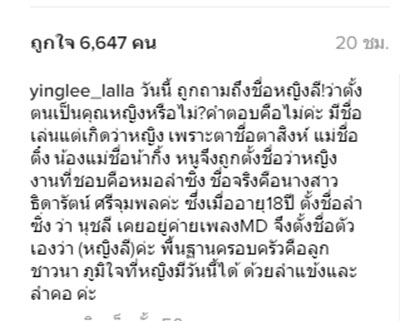 9 ก.ค. 59 ทำเอานักร้องสาวลูกทุ่ง "หญิงลี ศรีจุมพล" ถึงกับผวา รีบโพสต์ข้อความชี้แจงผ่านอินสตาแกรม @yinglee_lalla เนื่องจากกลัวว่าคนจะเข้าใจผิดว่า ตั้งตนเองเป็นคุณหญิง เหมือนกรณี "หญิงไก่"โดยระบุว่า