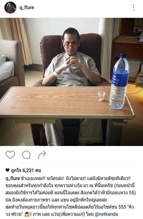 ล่าสุด (16 ก.ค.) หนุ่มคิวก็ได้โพสต์อินสตาแกรมส่วนตัวอัพเดทอาการป่วยเป็นครั้งแรก ว่า ข้าเองเเหละ!! จะใครล่ะ! ยังไม่ตาย!! เเต่ยังมิหายดีซะทีเดียว!! ขอบคุณสำหรับทุกกำลังใจ ทุกความห่วงใย มา ณ ที่นี้นะครัช (ก่อนหน้านี้สมองยังใช้การได้ไม่ค่อยดี ตอนนี้โอเคละ สังเกตได้ว่าหัวมีรอยเเหว่ง 55) ปล.ยังคงต้องกายภาพขา เเละ เเขน อยู่อีกพักใหญ่เลยล่ะ สุดท้ายวันหยุดยาวนี้ขอให้ทุกท่านโชคดีปลอดภัยไร้มอไซค์ชน 555 "คิว วง ฟรวย"