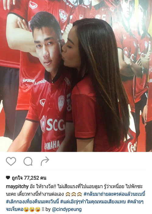 25 ก.ค.59 ดูจะหวานขึ้นทุกวันจริงๆ สำหรับคู่รักอย่าง "เมย์ พิชญ์นาฏ" และแฟนหนุ่ม "เจ ชนาธิป" ที่ล่าสุด เมื่อวานนี้สาวเมย์ได้ไปเชียร์แฟนหนุ่มถึงขอบสนาม ในฟุตบอลบิ๊กแมตช์ระหว่าง เอสซีจี เมืองทอง ยูไนเต็ด พบกับ บุรีรัมย์ ยูไนเต็ด