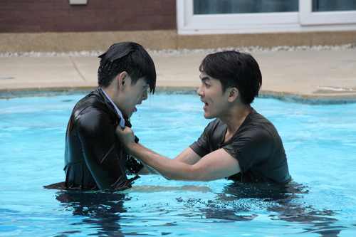 สำหรับฉากนี้เป็นฉากที่ชลกร (แบงค์) รู้เรื่องที่ชยพล (เอี๊ยง) ไปข่มขืนปานดาว (จูน) ชลกรเลยลากตัวชยพลออกมาชลกรเหวี่ยงหมัดใส่หน้าชยพลเต็มแรงจนชยพลเซล้มลงชยพลรู้สึกงงทำไมชลกรมาต่อยตนพยายามลุกขึ้นแต่ชลกรก็เข้ามาต่อยซ้ำจนทรุดลงไปอีกชลกรต่อยชยพลจนตกน้ำแล้วตามไปซ้ำในสระว่ายน้ำกดหัวชยพลเพื่อเรียกสติกลับมาเบื้องหลังการถ่ายทำฉากนี้ยกกองถ่ายทำกันที่หมู่บ้านปัญญารามอินทราเนื่องด้วยฉากนี้ถ่ายทำกันยาวนาน ผู้กำกับเอ๋-กษมา เลยให้แบงค์-เอี๊ยง ทำสมาธิให้พร้อมกันซะก่อน เพราะบทยิ่งยาวอยู่ด้วย เมื่อพร้อมก็ให้ทั้งสองมาซ้อมเรื่องคิวบู๊เพราะไม่อยากให้เกิดการผิดพลาดเกิดขึ้นและยิ่งจะต้องมีตอนตกน้ำด้วยถ้าเสื้อผ้าเปียกแล้วเริ่มถ่ายใหม่อีกครั้งไม่ได้ เพราะฉะนั้นจะถ่ายจริงก็ต่อเมื่อทั้งสองพร้อม ช่วงซ้อมแบงค์ เอี๊ยงเลยตั้งใจกันเป็นพิเศษ สองหนุ่มนัดแนะคิว เพื่อที่จะได้ไม่พลาด พร้อมเทคนิคต่างๆ จากผู้กำกับด้วย เมื่อซ้อมกันจนเป๊ะ ก็ลงมือถ่ายจริง