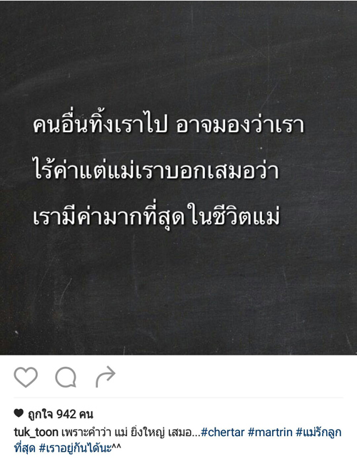 29 ส.ค.59 มีประเด็นดร่ามาอีกแล้ว เมื่อสาว "ตุ๊กตุ่น รจเลข" ภรรยาของนักร้องหนุ่ม "ตั้ม สุธน" หรือ "ตั้ม เดอะสตาร์ 10" ได้โพสต์ข้อความเศร้าๆ ผ่านอินสตาแกรมส่วนตัว ว่า "คนอื่นทิ้งเราไป อาจมองว่าเราไร้ค่า แต่แม่เราบอกเสมอว่าเรามีค่ามากที่สุดในชีวิตแม่"