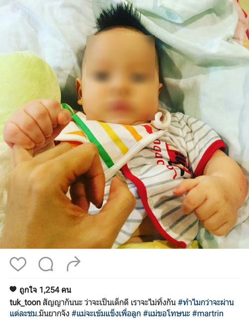 และโพสต์ภาพลูกชาย "น้องมาติน" พร้อมข้อความว่า "สัญญากันนะ ว่าจะเป็นเด็กดี เราจะไม่ทิ้งกัน #ทำไมกว่าจะผ่านแต่ละ ชม. มันยากจัง #แม่จะเข้มแข็งเพื่อลูก #แม่ขอโทษนะ #martrin"