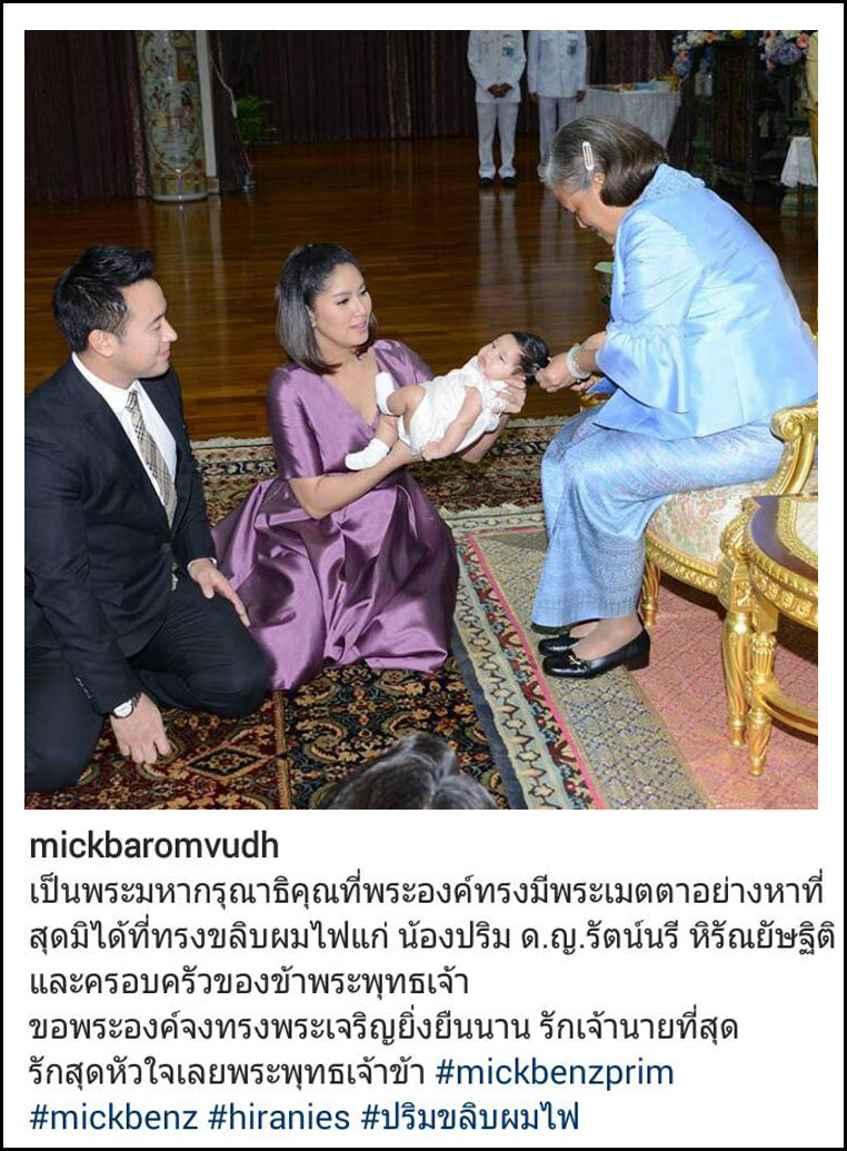 ทั้งนี้ คุณพ่อป้ายแดง มิค บรมวุฒิ ได้โพสต์ภาพพร้อมข้อความว่า "เป็นพระมหากรุณาธิคุณที่พระองค์ทรงมีพระเมตตาอย่างหาที่สุดมิได้ที่ทรงขลิบผมไฟแก่ น้องปริม ด.ญ.รัตน์นรี หิรัณยัษฐิติ และครอบครัวของข้าพระพุทธเจ้า ขอพระองค์จงทรงพระเจริญยิ่งยืนนาน รักเจ้านายที่สุด รักสุดหัวใจเลยพระพุทธเจ้าข้า #mickbenzprim #mickbenz #hiranies #ปริมขลิบผมไฟ "