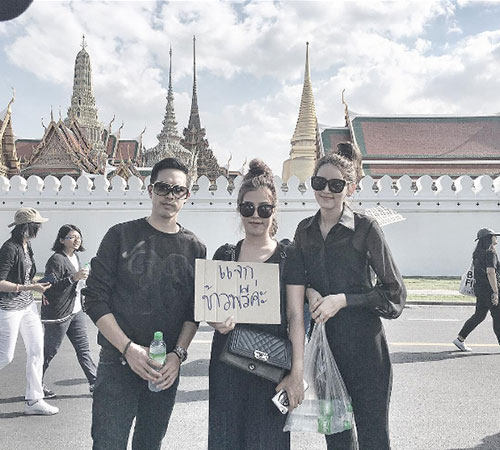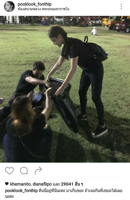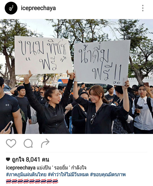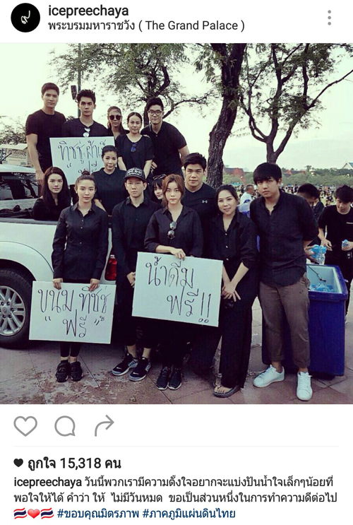 16 ต.ค.59 ท่ามกลางบรรยากาศอันโศกเศร้า ยังมีกลุ่มคนอีกจำนวนหนึ่งที่ขอแปรเปลี่ยนความโศกเศร้ามาเป็นพลังแห่งการทำดีตามรอยพ่อ เพื่อถวายเป็นพระราชกุศล อย่างคนดังจากวงการบันเทิง อาทิ ปุ๊กลุ๊ก ฝนทิพย์, แตงโม นิดา, เดียร์น่า ฟลีโป,แฮ็ค ชวนชื่น, บ้านฉัตรบริรักษ์ พวกเขาเหล่านี้พร้อมใจกันนำอาหารออกแจกจ่าย บริการยานพาหนะรับ-ส่งฟรี รวมไปถึงบริการเก็บขยะตามจุดต่างๆ ในพื้นที่ เพื่อสำนึกในพระมหากรุณาธิคุณของ 'พ่อหลวง' อันล้นพ้นอย่างหาที่เปรียบมิได้