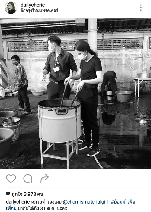 ล่าสุด ชมพู่ก็ขอทำความดีเพื่อพ่อหลวงด้วยการอาสาย้อมผ้าด้วยตัวเอง ในโครงการย้อมผ้าเพื่อเพื่อน ซึ่งเป็นโครงการที่รับบริจาคเสื้อที่ไม่ใช้แล้วสีใดก็ได้ เพื่อนำมาย้อมเป็นสีดำและนำไปแจกผู้ที่ขาดแคลนทุนทรัพย์ เรียกว่าเป็นโครงการที่ดีมากๆ อีกโครงการหนึ่งเลยทีเดียว