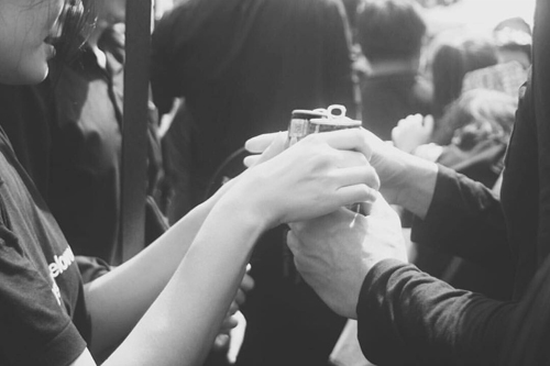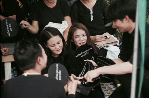 ซึ่งทั้งคู่พร้อมกับกลุ่มเพื่อนๆ ก็ได้นำพัดและกาแฟกระป๋องไปแจกจ่ายให้กับประชาชนที่มาร่วมร้องเพลง เรียกว่าเป็นอีกหนึ่งเรื่องราวดีๆ ของน้ำใจคนไทย