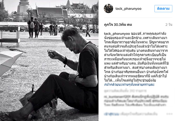 30 ต.ค.59 เป็นอีกหนึ่งคนดังที่ขอทุ่มแรงกายทำเพื่อพ่อ สำหรับดาราหนุ่ม "แทค ภรัณยู" ที่เจ้าตัวได้ไปเป็นจิตอาสาบริการประชาชนที่รอเข้าสักการะพระบรมศพ บริเวณท้องสนามหลวง โดยล่าสุด หนุ่มแทคได้โพสต์รูปภาพน่าชื่นชมลงบนอินสตาแกรม