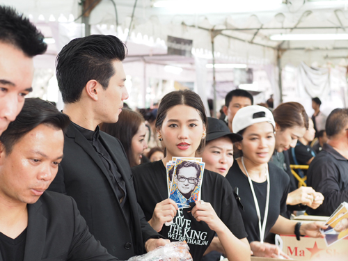 “วันนี้ขอเน้นแจกของใช้นะคะเพราะทราบว่าอาหารและน้ำมีเพียงพอแล้ว ซึ่งวันนี้เป็นการรวบรวมไม่ว่าจะเสื้อ รองเท้า ทั้งหมดทั้งมวลมาจากคนใกล้ตัวทั้งนั้นเลยค่ะ ก็จะเป็น เสื้อสีดำ กระโปรงสีดำ หมวกสีดำ โบไว้อาลัยที่ทำมือเอง ยาดม ยาหม่อง หรือจะเป็นรองเท้าสีดำหุ้มส้น ซึ่งใส่ได้ทั้งผู้ชายและผู้หญิงเลยค่ะ ส่วนที่เมทัลกับพี่โดมตั้งใจทำอย่างสุดพิเศษมามอบให้กับทุกคนก็คือ เป็นโปสต์การ์ดพระบรมฉายาลักษณ์ ค่ะ อันนี้เราตั้งใจทำกันออกมาด้วยหัวใจที่เต็มเปี่ยมไปด้วยความรักพระองค์ค่ะ ในส่วนของโปสต์การ์ดพระบรมฉายาลักษณ์ ก็ราวๆ 1,200 ใบได้ค่ะ หนูเองกับพี่โดมและพวกเราค่อยๆ ทยอยเอาของออกมา เพราะคนมาออกันเยอะมาก เลยค่อยๆ แจกทีละอย่างสองอย่าง แต่ก็ทั่วถึงทุกคนอย่างดี ไม่ถึง 1 ชั่วโมง ก็บรรลุวัตถุประสงค์ของวันนี้แล้วค่ะ ซึ่งวันนี้ก็ได้รับความอนุเคราะห์จากบูธการไฟฟ้านครหลวง ก็ต้องขอขอบคุณด้วยนะคะที่ร่วมมือร่วมใจกัน สิ่งสำคัญตอนนี้เลยหนูและพี่โดมก็อยากฝากให้ทุกๆ คนที่เป็นลูกของพระราชา รักและจะเดินตามพ่อหลวงเหมือนกันทุกๆ คนนะคะ ฝากดูแลเรื่องของขยะที่เป็นของกินของตนเองกันด้วย เก็บทิ้งให้ถูกที่จะดีที่สุด ของใครของมัน กินได้ก็ต้องทิ้งได้ถูกที่นะคะ เพื่อแบ่งเบาพี่ๆ จิตอาสาที่เค้าเหนื่อยอยู่แล้ว”