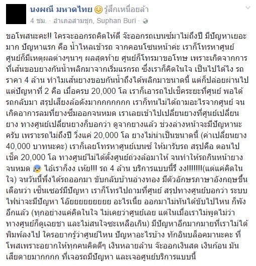 ก่อนมาเจอปัญหาที่ 2 คือ เมื่อครบ 20,000 กิโลเมตร เอารถไปเช็คระยะที่ศูนย์ พอได้รถกลับมาเสียงล้อดังมาก จนเกิดอาการลมที่ยางซึมออกจนหมดเลยเข้าไปเปลี่ยนยางที่ศูนย์เปลี่ยนยาง ทางศูนย์ยางก็บอกว่าดูจากยางแล้ว ช่วงล่างหน้าจะมีปัญหา เพราะรถไม่ถึงปีวิ่งแค่ 20,000 กิโลเมตร ยางไม่น่าเป็นขนาดนี้ เสียค่าเปลี่ยนยางไปอีก 40,000 บาท เลยโทรหาศูนย์รถให้มารับรถ สรุปคือตอนไปเช็ครถ ทางศูนย์ไม่ได้ตั้งศูนย์ถ่วงล้อมาให้ จนทำให้รถกินหน้ายางจนหมด เห้ย !!! รถ 4 ล้าน บริการแบบนี้รึ