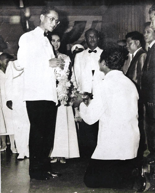 ผมเคยแต่ไปยืนอยู่ริมถนนเฝ้าฯรับเสด็จ แล้วผมทันสมัย ร.๘ ด้วยนะครับ ตอนนั้นอายุประมาณเกือบสิบขวบ ได้ไปถวายบังคม ร.๘ “พระบาทสมเด็จพระปรเมนทรมหาอานันทมหิดล พระอัฐมรามาธิบดินทร” ซึ่งพูดตามภาษาชาวบ้าน คือพระองค์หล่อมาก สมัยก่อนเดิมสำเพ็งจะมีนักเลงตีกันฟันกัน พอ ร.๘ เสด็จฯ ความงามความมีเสน่ห์ของพระองค์ท่านสุดจะพรรณนา ตอนนั้นพระองค์ท่านเสด็จฯไปทั้งสองพระองค์ คือมีในหลวงรัชกาลที่ ๙ เสด็จฯด้วย คนแซ่ซ้องกันทั้งสำเพ็ง ตั้งแต่นั้นมากลุ่มนักเลงที่ตีกันฟันแทงกัน พวกอั้งยี่ก็ไม่มีอีกเลย ไทยจีนก็เลยเป็นพี่น้องกัน ไม่มีการแบ่งแยก ต่อมาผมได้มีโอกาสติดตามคุณพ่อไปเมื่อครั้งที่ ร.๘เสด็จสวรรคต ได้ไปถวายบังคมพระบรมศพ โดยแต่งชุดลูกเสือไป เพราะตอนนั้นเรียนอยู่สักประมาณ ม.๑ คือคุณพ่อเป็นข้าราชการรถไฟเราเลยมีโอกาสติดตามคุณพ่อไปด้วย หลังจากนั้นพอในหลวงรัชกาลที่ ๙ ขึ้นครองราชย์ ก็ไม่ได้มีโอกาสเข้าเฝ้าฯ เพราะว่ายังเด็กอยู่