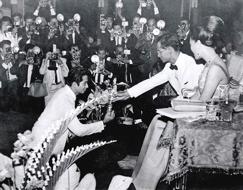 จนกระทั่งมาเป็นนักแสดง และได้มีโอกาสเข้าเฝ้าฯพระองค์ท่านตอนที่แสดงภาพยนตร์ โดยได้เข้าถวายความเคารพเมื่อครั้งที่พระบาทสมเด็จพระเจ้าอยู่หัวรัชกาลที่ ๙และสมเด็จพระนางเจ้าฯพระบรมราชินีนาถ ท่านเสด็จฯทอดพระเนตรภาพยนตร์เรื่องที่สอง ที่ผมแสดงคือ เรื่อง “สกาวเดือน”ตอนนั้นมีโรงภาพยนตร์อยู่ ๓ โรง ที่ติดกันคือ คิงส์, แกรนด์ และ ควีนส์ ภาพยนตร์ที่ผมแสดงเข้าโรงแกรนด์ ผมก็มีโอกาสได้เข้าไปทูลเกล้าฯถวายดอกไม้ให้กับพระองค์ท่าน“พี่แดง” (รัตนาภรณ์ อินทรกำแหง” ถวายพระหลวงปู่ทวด และมีคนอื่นถวายสิ่งของอีกสองถึงสามคน หลังจากที่ผมทูลเกล้าฯถวายดอกไม้แด่พระองค์ท่านแล้ว พระองค์ท่านก็เสด็จฯไปยังที่ประทับ และผมก็ออกไปร้องเพลงหน้าพระที่นั่งสามเพลง เพลงแรกคือ “สกาวเดือน” เป็นเพลงในภาพยนตร์เพลงที่สองเป็นเพลงฝรั่ง และเพลงที่สามเพลง“สุกี้ยากี้” ซึ่งเป็นเพลงญี่ปุ่นที่กำลังโด่งดังในขณะนั้น นั่นก็คือเป็นครั้งแรกที่ได้ถวายความเคารพพระองค์ท่าน และได้ร้องเพลงถวายพระองค์ท่านด้วยในฐานะนักแสดง สำหรับความรู้สึกตอนนั้น ไม่ได้ประหม่าอะไร เพราะว่าพระองค์ท่านประทับอยู่ด้านบน เราก็ร้องเพลงอยู่ไกลๆ ในหลวงไม่ทรงตรัสอะไร เพราะว่าโดยส่วนใหญ่สมเด็จพระนางเจ้าฯพระบรมราชินีนาถ จะเป็นผู้กล่าวชม ในหลวงท่านจะทรงยิ้ม และนี่ก็คือครั้งแรกที่ได้ถวายงานต่อมาคือได้รับพระราชทานโล่ที่ระลึกจากพระหัตถ์ของพระองค์ท่านในงานฟุตบอลการกุศล ซึ่งมีดาราในยุคนั้นลงสนามเตะฟุตบอลมากมาย