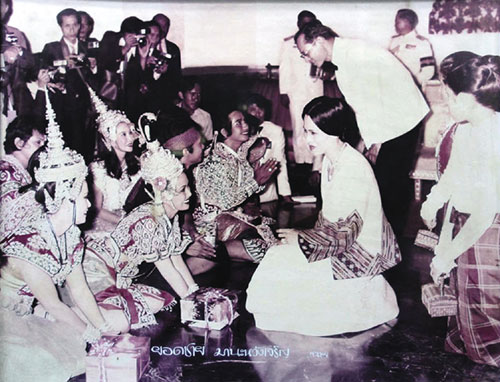 ลำดับต่อมาคืองานรวมใจไปสู่แนวหน้าคือทหารกล้าที่ออกไปปกป้องบ้านเมือง โดยมีการจัดงานเพื่อหาเงินช่วยเหลือเหล่าทหารเขาก็ให้ดารามาแสดงโขนแล้วก็ละคร เพื่อเป็นการช่วยหาเงิน โดยกราบบังคมทูลเชิญพระบาทสมเด็จพระเจ้าอยู่หัวและสมเด็จพระนางเจ้าฯพระบรมราชินีนาถ ทอดพระเนตรด้วย งานจัดขึ้นถึงสองครั้งด้วยกัน ในภาพคือเป็นครั้งที่สองนะครับ ครั้งแรกผมเล่นเป็นเจ้าเงาะ ครั้งที่สองเล่นเป็นพระราม ในภาพจะเห็นว่ามี “คุณพิศมัย วิไลศักดิ์” และนางเอกที่เกิดใหม่อีกหลายคนในยุคนั้นเข้าเฝ้าฯด้วย แล้วพระองค์ท่านก็พระราชทานของที่ระลึกให้กับนักแสดงทุกคน ที่ผมยิ้มในภาพนั้น จำไม่ค่อยได้แล้วเหมือนกันว่าเราพูดอะไรนะครับ คือในการที่จะกล่าวอะไรต่อหน้าพระพักตร์ของพระองค์ท่านนั้นรู้สึกว่าเบลอไปหมดเลย ตื่นเต้น ไม่รู้ว่าท่านตรัสหรือว่าท่านถามอะไร เราก็พูดอะไรนี่คือจับใจความไม่ได้เลย คนที่อยู่ข้างๆ วันนั้นเขาก็มาทักในภายหลังว่าพี่แอ๊ดพูดว่าอะไรมิตซูบิชิๆอะไร (ยิ้มปลื้ม) คือจับใจความอะไรไม่ได้เลย ด้วยความตื่นเต้นก็เลยเห็นแต่รอยยิ้มที่เปี่ยมไปด้วยความปลื้มปีติ
