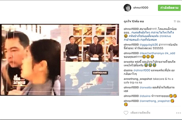 นอกจากนี้ สาวอ้น ยังโพสต์ข้อความผ่านอินสตาแกรมส่วนตัว @ohnsri1000 ยืนยันว่าเจ้าตัวยังสบายดีอยู่ ข้อความว่า "สบายดีคร่าาา!!..โงนเงนเล็กน้อยยยย.. #แผ่นดินยังไหว #เราจะไม่ไหวได้ไง #หันข้างโชว์เอลตั้นจอห์น @tmklive #เปารอดแล้ว #ลุงก็ต้องรอด"