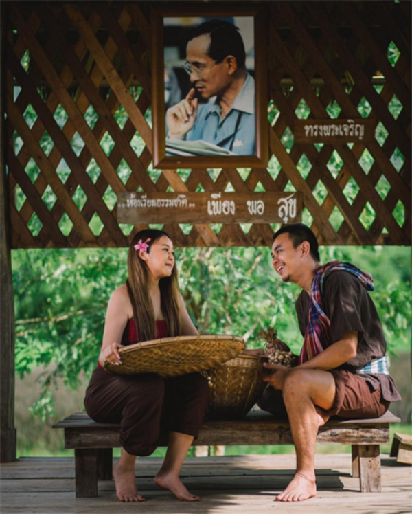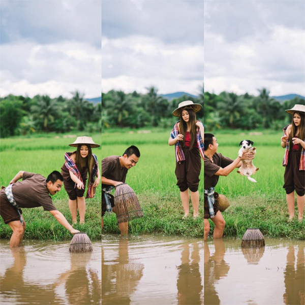 โดยก่อนที่จะถึงวันงานพิธี ทั้งคู่ก็ได้จูงมือกันไปถ่ายภาพพรีเวดดิ้งไกลถึง จ.เลย โดยหนึ่งในเซตภาพที่เรียกเสียงฮือฮาและสร้างความประทับใจ คือภาพถ่ายที่ทั้งสองจำลองวิถีชาวนา ที่ยึดหลักปรัญชาเศรษฐกิจพอเพียงของในหลวงรัชกาลที่ 9 พร้อมนำมาโพสต์ในอินสตาแกรมส่วนตัวให้แฟนคลับได้ร่วมยินดีกับความรักของทั้งคู่อีกด้วย