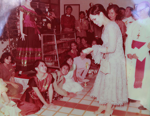 ภาพแรกเป็นงานการกุศลของโรงเรียนเซนต์ฟรังซีสซาเวียร์คอนแวนต์ แต่ตนเองไม่ได้จบเซนต์ฟรังนะคะ คือโรงเรียนสอนตัดเสื้อกิติยา ขอมาว่าให้เราไปเดินแบบเสื้อผ้าที่เป็นชุดไทย และสมเด็จพระราชินีท่านก็เสด็จฯงานของเซนต์ฟรังอยู่แล้ว ตอนนั้นได้รอเฝ้าฯรับเสด็จ และในภาพก็ยิ้มด้วยค่ะ เพราะว่าพระองค์ท่านทรงมีรับสั่งด้วยว่าเห็นข่าวลงว่าจะเลิกแสดงหนังแล้วเหรอ เราก็ยิ่งปลื้มปิติในความสนพระทัยของพระองค์ท่าน แสดงว่าพระองค์ท่านอ่านข่าว ก็ได้ตอบกลับไปว่ายังไม่เลิกแสดงเพคะ คือช่วงนั้นมีข่าวลงว่าเรากำลังจะแต่งงาน และเหมือนว่าจะเลิกแสดงหนังแต่จริงๆ ไม่ใช่นะคะ หนังสือพิมพ์คงจะเข้าใจผิด และลงข่าวไป แล้วสมเด็จพระราชินีท่านทรงคุยเก่ง เราก็จะไม่ประหม่า ท่านให้ความเป็นกันเอง นอกจากนี้ท่านยังชมว่าเราเป็นผู้หญิงที่ผิวสวยนะ แล้วดูสิเราเนี่ยไปตากแดดมา ในภาพก็จะเห็นพระองค์ท่านยกแขนเราก็จำที่พระองค์ท่านรับสั่งกับเราได้ เพราะรู้สึกว่าเป็นมงคลกับเรามาก คือท่านเป็นผู้หญิงที่คุยเก่งดังนั้นเราก็จะไม่ประหม่าค่ะ