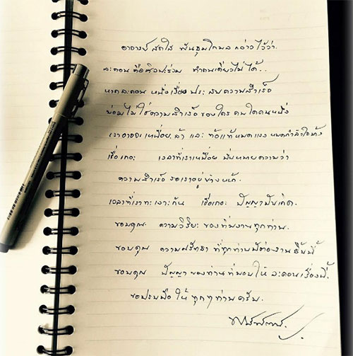 "อาจารย์สดใส พันธุมโกมล กล่าวไว้ว่า ละคอน คือ ศิลปะร่วม ทำคนเดียวไม่ได้.. หากละคอน หนึ่งเรื่องประสบความสำเร็จ ย่อมไม่ใช่ความสำเร็จของใครคนใดคนหนึ่ง เราอาจจะเหนื่อยล้าและท้อแท้หมดแรง หมดกำลังใจบ้าง เชื่อเถอะเวลาที่เราเหนื่อย นั่นหมายความว่าความสำเร็จรอเราอยู่ข้างหน้า เวลาที่เราทะเลาะกัน เชื่อเถอะ ปัญญามันเกิด ขอบคุณ ความวิริยะของทีมงานทุกท่าน ขอบคุณ ความศรัทธาที่ทุกท่านมีต่องานชิ้นนี้ ขอบคุณ ปัญญาของท่านที่มอบให้ละคอนเรื่องนี้ ขอปรบมือให้ทุกๆ ท่านครับ."