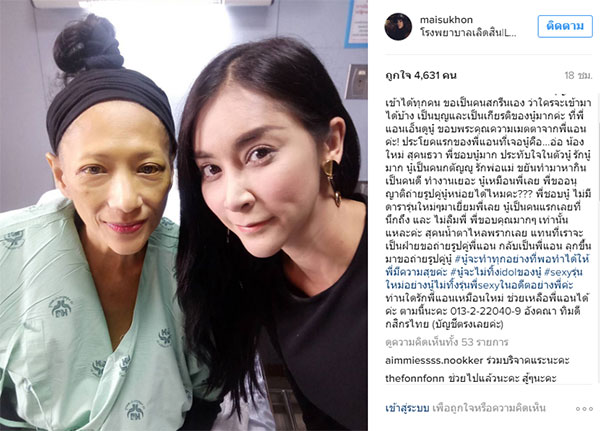 ล่าสุดดาราสาว "ใหม่ สุคนธวา" ได้เดินทางไปเยี่ยมให้กำลังใจ พร้อมเผยความประทับใจที่ทำเอาน้ำตาไหลว่า "หนูมาหาพี่แล้วนะคะ idol ของหนู...เกือบจะไม่ได้เข้ามาแล้ว ลุ้นอยู่เป็น ชม.แต่แรงใจของหนู และสิ่งที่หนูจะมาช่วยพี่ มันก็ส่งถึงพี่จนได้ค่ะ ภาวนาตลอดการขับรถว่าขอให้ได้เข้าไปหาพี่ เพราะพยาบาลบอกว่า พี่แอนไม่อนุญาติให้เข้าได้ทุกคน ขอเป็นคนสกรีนเอง ว่าใครจะเข้ามาได้บ้าง เป็นบุญและเป็นเกียรติของหนูมากค่ะ ที่พี่แอนเอ็นดูหนู ขอบพระคุณความเมตตาจากพี่แอนค่ะ!