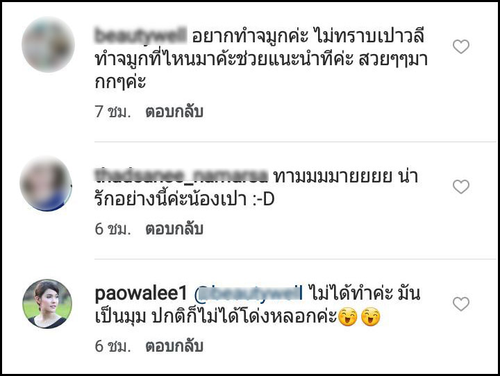 ล่าสุดบนอินสตาแกรมส่วนตัว paowalee1 เจ้าตัวได้โพสต์ภาพพร้อมงัดดั้งโชว์กันเห็นๆ พร้อมตอบคำถามชาวเน็ตรายหนึ่งว่า "ไม่ได้ทำค่ะ มันเป็นมุมกล้อง ปกติก็ไม่ได้โด่งหรอกค่ะ"