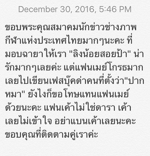 พร้อมทั้งโพสต์ข้อความและกำลังใจที่ส่งมาให้ พร้อมแคปชั่นว่า “วันนี้มีไดเร็คมาทั้งวันเลย ขอบคุณทุกคนที่ให้กำลังใจคู่เรานะคะ ขอบคุณมากๆค่ะ ปล่อยพวกเค้าไปเถอะค่ะ555”