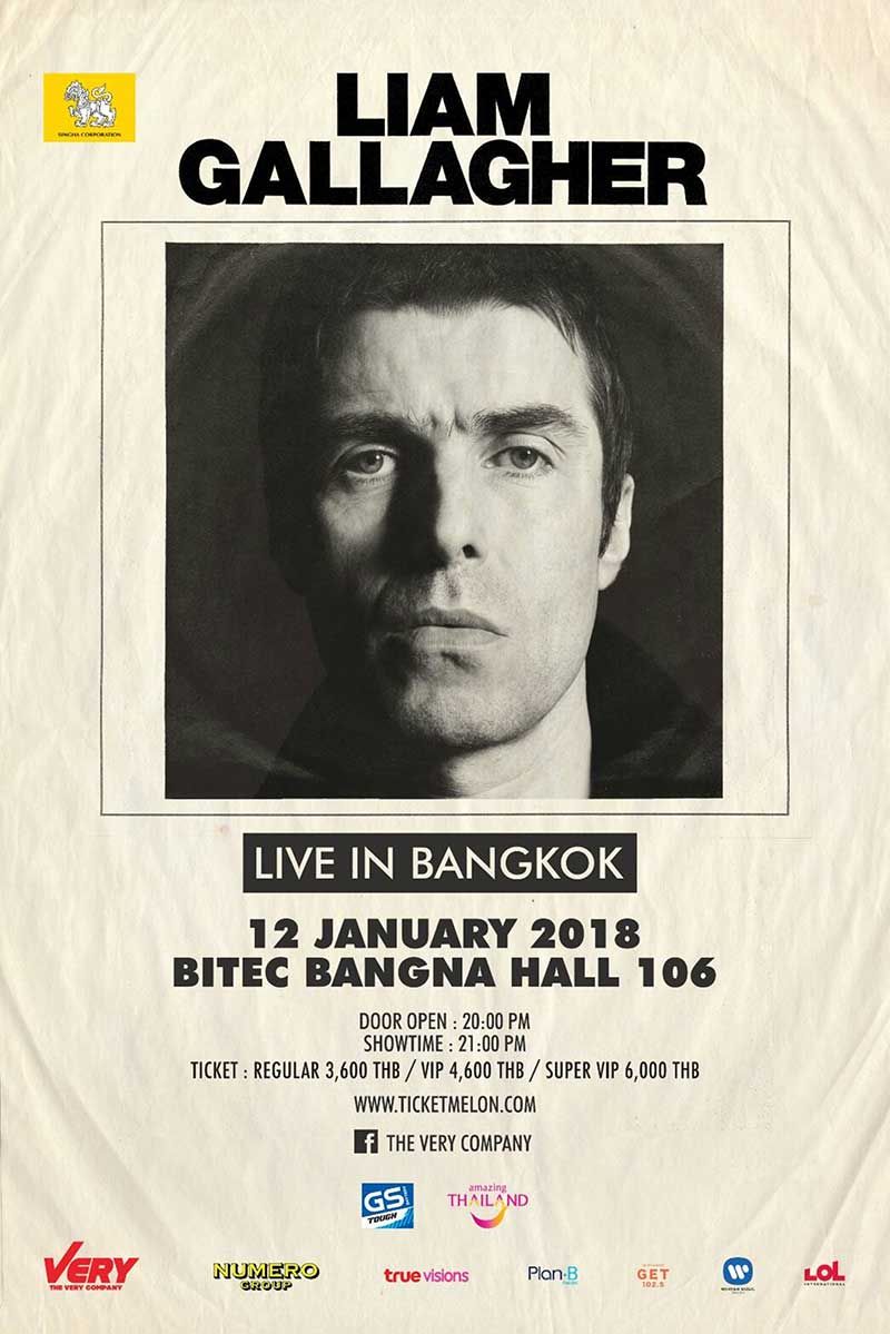 เตรียมพบกับตำนานเพลงร็อคคนนี้ได้ใน "LIAM GALLAGHER LIVE IN BANGKOK" วันศุกร์ที่12 มกราคม 2561 ที่ BITEC BANGNA HALL 106 ประตูเปิด 19:00 น. และการแสดงเริ่ม 21:00 น. บัตร Regular ราคา 3,600 บาท และ VIP ราคา 4,600 และ Super VIP Lounge ราคา 6,000 บาท ซื้อบัตรได้ที่ http://www.ticketmelon.com/event/LiamGallagher