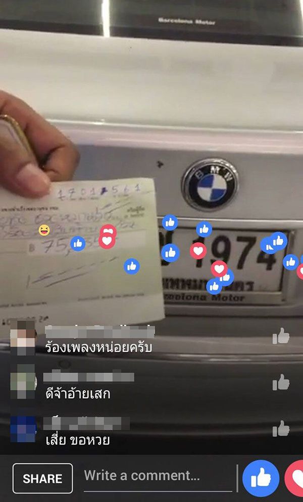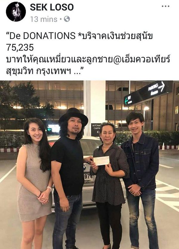 ล่าสุดเมื่อช่วงค่ำของวันที่ 16 มกราคม 2561 เสก โลโซได้ไลฟ์สดในมุมดีๆ ของชีวิตร็อคเกอร์สตาร์ผ่านเฟซบุ๊ก SEK LOSO ด้วยการบริจาคเงินช่วยเหลือน้องหมาเป็นจำนวน 75,235 บาท ซึ่งงานนี้ก็มิวายที่บรรดาแฟนคลับรวมถึงคอหวยจะแห่กันตามเลขทะเบียนรถของเสก (ชช 1974 กรุงเทพมหานคร) ซึ่งเป็นเลขเดียวกับ ปี ค.ศ.เกิดของเจ้าตัว เพื่อลุ้นผลการออกรางวัลสลากกินแบ่งรัฐบาลงวดวันที่ 17 มกราคม 2561 ทั้งนี้ เสก โลโซ ยังได้บอกใบ้ผ่านไลฟ์กับแฟนๆ ให้ตามหมายเลขเช็คอีกด้วย เอาเป็นว่างานนี้เป็นความเชื่อส่วนบุคคล เตือนกันอีกครั้งโปรดใช้วิจารณญาณในการรับชมนะจ๊ะๆ