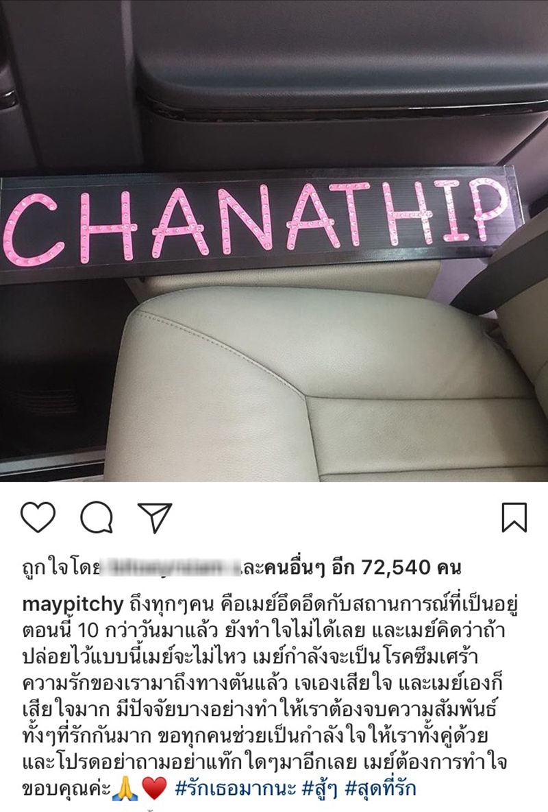 “ถึงทุกๆคน คือเมย์อึดอึดกับสถานการณ์ที่เป็นอยู่ตอนนี้ 10 กว่าวันมาแล้ว ยังทำใจไม่ได้เลย และเมย์คิดว่าถ้าปล่อยไว้แบบนี้เมย์จะไม่ไหว เมย์กำลังจะเป็นโรคซึมเศร้า ความรักของเรามาถึงทางตันแล้ว เจเองเสียใจ และเมย์เองก็เสียใจมาก มีปัจจัยบางอย่างทำให้เราต้องจบความสัมพันธ์ทั้งๆ ที่รักกันมาก ขอทุกคนช่วยเป็นกำลังใจให้เราทั้งคู่ด้วย และโปรดอย่าถามอย่าแท๊กใดๆมาอีกเลย เมย์ต้องการทำใจ ขอบคุณค่ะ #รักเธอมากนะ #สู้ๆ #สุดที่รัก”