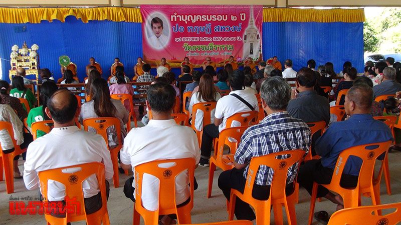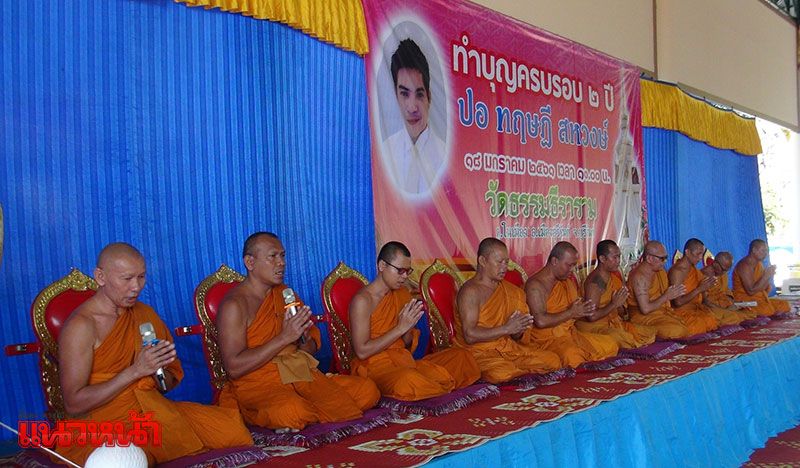 18 ม.ค.61 บรรยากาศการประกอบพิธีทำบุญครบรอบ 2 ปี กับการเสียชีวิตของ ปอ ทฤษฎี สหวงษ์ พระเอกหนุ่มขวัญใจมหาชน ที่เสียชีวิตจากอาการป่วยด้วยโรคไข้เลือดออกขั้นรุนแรง เมื่อวันที่ 18 มกราคม 2559 ได้จัดขึ้น ที่บริเวณศาลายอดเมืองเจริญ ด้านข้างเจดีย์บรรจุอัฐิ ปอ ทฤษฎี ภายในวัดธรรมธีราราม หรือวัดป่าหลังโรงเลื่อย ต.ในเมือง อ.เมือง จ.บุรีรัมย์ ซึ่งตั้งแต่ช่วงเช้าได้มีญาติพี่น้อง แฟนคลับ ประชาชน และผู้ที่รู้จักคุ้นเคยทั้งใน จ.บุรีรัมย์ และต่างจังหวัดทยอยเดินทางมาร่วมงานอย่างต่อเนื่อง