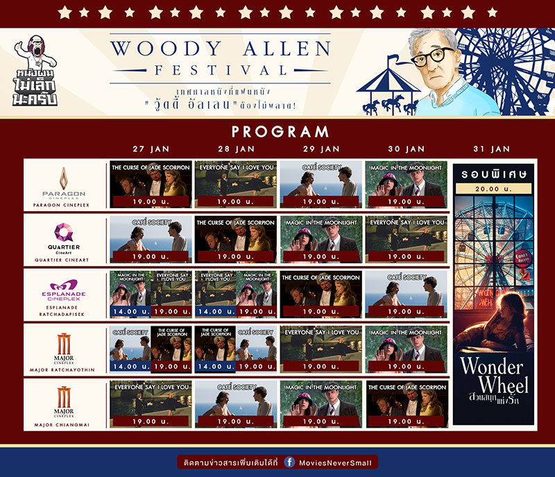 M PICTURES ขอเชิญชวนคอหนังวอร์มเครื่องต้อนรับการกลับมาของ "วู้ดดี้ อัลเลน" กับภาพยนตร์คุณภาพทั้ง 4 เรื่องภายใต้เทศกาล "WOODY ALLEN FESTIVAL"(Everyone Says I Love You, The Curse of the Jade Scorpion, Magic in the Moonlight, Café Society) พร้อมนับถอยหลังสู่ "Wonder Wheel สวนสนุกแห่งรัก" พร้อมกัน 1กุมภาพันธ์นี้ ในโรงภาพยนตร์ (เปิดฉายรอบพิเศษวันที่ 31 มกราคม 2561 ณ โรงภาพยนตร์ในเครือเมเจอร์ซีเพล็กซ์ที่ร่วมกิจกรรมทั้ง 5 สาขา)