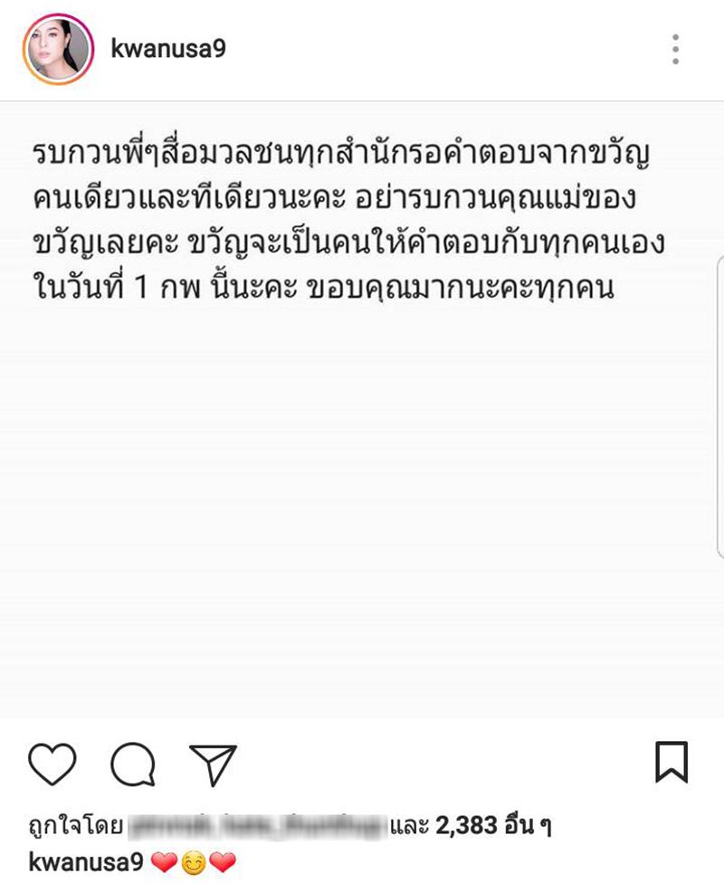 ต่อมา นักข่าวหลายสำนักจะกระหน่ำติดต่อไปถามความจริงกับแม่ของสาวขวัญ จนสาวขวัญต้องโพสต์อินสตาแกรมส่วนตัว ว่า รบกวนพี่ๆ สื่อมวลชนทุกสำนักรอคำตอบจากขวัญคนเดียวและทีเดียวนะคะ อย่ารบกวนคุณแม่ของขวัญเลยค่ะ ขวัญจะเป็นคนให้คำตอบกับทุกคนเอง ในวันที่ 1 กุมภาพันธ์นี้นะคะ ขอบคุณมากนะคะทุกคน