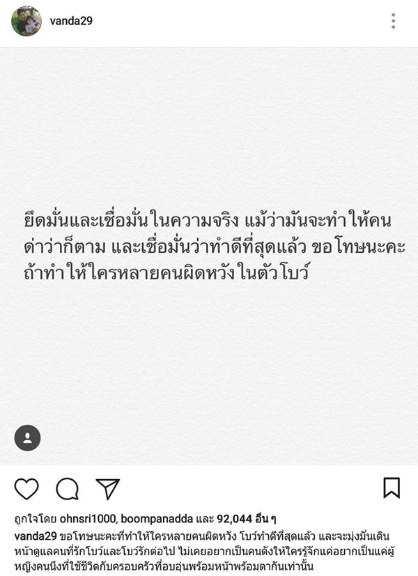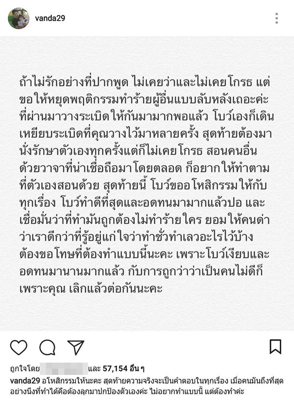 ทำเอาแฟนคลับหลายตกใจหนักมาก เมื่อคุณแม่คนเก่ง “โบว์ แวนด้า สหวงษ์” ออกมาโพสต์ข้อความสุดทน ผ่านอินสตาแกรมส่วนตัว ระบุว่า…“ถ้าไม่รักอย่างที่ปากพูด ไม่เคยว่าและไม่เคยโกรธ แต่ขอให้หยุดพฤติกรรมทำร้ายผู้อื่นแบบลับหลังเถอะค่ะ ที่ผ่านมาวางระเบิดให้กันมามากพอแล้ว โบว์เองก็เดินเหยียบระเบิดที่คุณวางไว้มาหลายครั้ง สุดท้ายต้องมานั่งรักษาตัวเองทุกครั้งแต่ก็ไม่เคยโกรธ