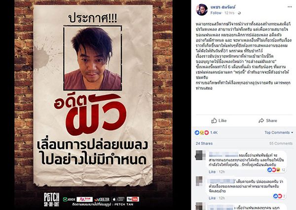 “หลายกระแสวิพากษ์วิจารณ์ว่าเราทั้งสองสร้างกระแสเพื่อโปรโมทเพลง สาบานว่าไม่จริงครับ แต่เพื่อความสบายใจของแฟนเพลง ผมขอยกเลิกการปล่อยเพลง อดีตผัว อย่างไม่มีกำหนด และ จะหาเพลงอื่นที่ไม่เกี่ยวข้องกับเรื่องราวที่เกิดขึ้นมาให้แฟนๆที่ยังต้องการเสพผลงานของผม ได้ฟังให้ทันวันที่31 มกราคม ที่รับปากไว้ เรื่องราวมันวุ่นวายหนักหนาที่ผ่านเข้ามาในชีวิต ขออนุญาตใช้ชื่อเพลงใหม่ว่า “กะส่างแม่มันเถาะ” ซึ่งเพลงนี้ผมทำไว้ 6 เดือนที่แล้ว ร่วมกับน้องๆ ทีมงาน เชฟแห่งแดนปลาแดก “พรุ่งนี้” ถ้าทันอาจจะมีตัวอย่างให้ชมครับ กราบขอโทษที่ทำให้เรื่องทุกอย่างดูวุ่นวายครับ เคารพทุกท่านเสมอ”