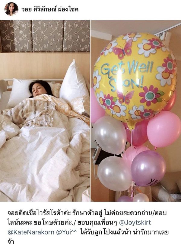 กลายเป็นโรคยอดฮิตไปซะแล้วสำหรับ ‘ไวรัสโรต้า’ที่กำลังแพร่ระบาดอยู่ในขณะนี้ล่าสุด ‘จอย ศิริลักษณ์’ก็ถูกหามตัวส่งโรงพยาบาล ซึ่งสาวจอยก็ได้อัปเดทความเคลื่อนไหวผ่านโซเชียลให้แฟนๆ ได้รับรู้กันว่า "จอยติดเชื้อไวรัสโรต้าค่ะ รักษาตัวอยู่ ไม่สะดวกอ่าน/ตอบไลน์นะคะ ขอโทษด้วยค่ะ ขอบคุณเพื่อนๆ @joytskirt @katenarakorn @yui ได้รับลูกโป่งแล้วน้า น่ารักมากเลยจ้า" บ๊ะแล้วๆๆ โรคภัยไข้เจ็บไม่เข้าใครออกใครจริงๆ แม้ล่าสุดสาวจอยจะหายป่วยออกจากโรงพยาบาลเป็นที่เรียบร้อยแล้วก็ตาม แต่ยังไงคงต้องดูแลสุขภาพกันต่อ เป็นกำลังใจให้คนสวยแข็งแรงโดยไวจ้า