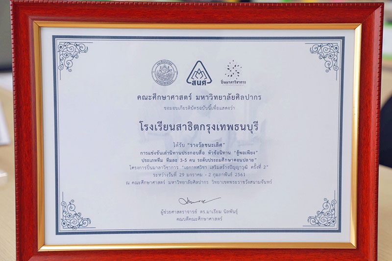 กิจกรรมก็เด่น วิชาการก็ไม่เคยด้อย ด้วยเพราะเน้น ให้โรงเรียนสาธิตกรุงเทพธนบุรีเป็นเสมือน “บ้านหลังที่สองของนักเรียน” ล่าสุด คุณเอิร์น-จิรวรรณ ชัยรุ่งเรือง รองผู้จัดการ โรงเรียนสาธิตกรุงเทพธนบุรี ขอแสดงความยินดีกับ นักเรียนระดับชั้นประถมศึกษาปีที่ 4 โรงเรียนสาธิตกรุงเทพธนบุรีประกอบด้วย ด.ช.ปุญญ เลี้ยงอำนวย, ด.ช.อัศวิน เอื้ออารีย์จิต, ด.ญ.ณัชชา ลิมป์ศิริวรารักษ์, ด.ญ.กัญญ์พรภัสร์ ดวงสิทธิสมบัติ,ด.ญ.ภิชญา รอกสุวรรณ ที่ได้รับรางวัลชนะเลิศการแข่งขันเล่านิทานประกอบสื่อ ประเภททีม ทีมละ3-5 คน ระดับประถมศึกษาตอนปลาย ชั้นประถมศึกษาปีที่ 4-6 หัวข้อนิทาน “ตู้พอเพียง”ในโครงการปิ่นมาลาวิชาการ “เอกาทศวิชา เสริมสร้างปัญญาวุฒิ ครั้งที่ 2” ระหว่างวันที่ 29 มกราคม-2 กุมภาพันธ์ พ.ศ. 2561 ณ คณะศึกษาศาสตร์ มหาวิทยาลัยศิลปากร วิทยาเขตพระราชวังสนามจันทร์ และได้เข้ารับโล่และประกาศนียบัตรจาก หม่อมหลวง ปนัดดา ดิศกุล ผู้ช่วยรัฐมนตรีประจำนายกรัฐมนตรี เมื่อวันที่ 2 ก.พ. 2561 ที่ผ่านมาผู้ปกครองหรือนักเรียนที่สนใจสอบถามรายละเอียดเพิ่มเติมได้ที่ โทร.02-4081919-28, 02-4088111,02-4081555 หรือ www.satitbtu.ac.th