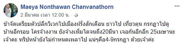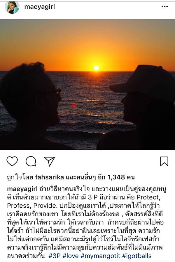 ซึ่งที่ผ่านมา สาวเมญ่า ไม่ค่อยได้เปิดเผยเรื่องราวความรักสักเท่าไหร่ ทั้งคู่รู้จักกันโดยคำแนะนำของเพื่อน และได้ทำธุรกิจร้านอาหารร่วมกันในซอยสุขุมวิท 45 ตอนนี้อยู่ในช่วงเคลียร์คิวหาฤกษ์งามยามดี แพลนเอาไว้ว่าจะจัดงานแต่งภายในปีนี้แน่นอน